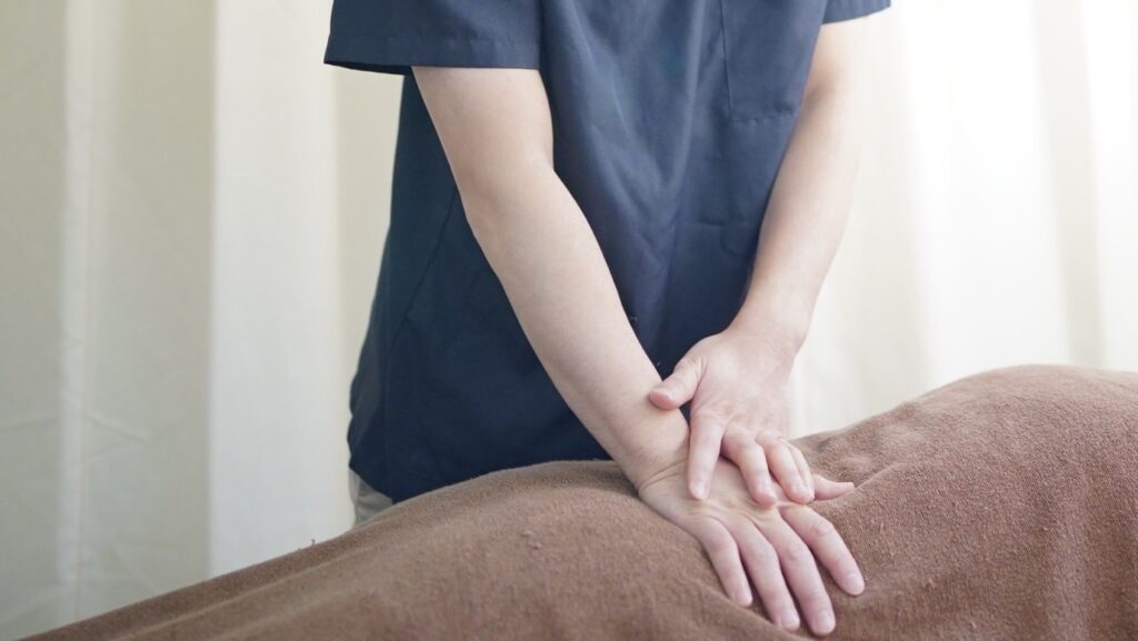 首・肩〜背中・腰の可動域を評価し、全身の筋肉をまんべんなくゆるめながら、骨盤〜背骨を重点的に整える施術。