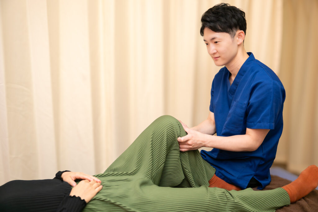 膝の周りをただ揉むだけでなく、背骨・骨盤の傾き、重心・姿勢・呼吸など全身の状態を検査しながら、筋肉や関節を優しく整えます。腫れや炎症が強い場合はアイシングや安静指導が最優先。落ち着いた後から、膝を守る筋肉の使い方やセルフケアの指導も丁寧に行います。