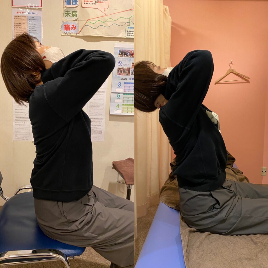 施術が一通り終わり、最初に行った背中の動きのチェックを再度行いました。椅子に浅く腰掛け、首の後ろで手を組み、上体を後ろに反らせる動作です。